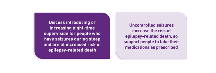 NICE NG217 advises discussing SUDEP from the time of diagnosis and continuing throughout care. To reduce the risk of SUDEP and provide optimal patient care, HCPs need to recognise risk factors such as uncontrolled seizures or drug-resistant epilepsy, focal to bilateral tonic-clonic or generalised tonic-clonic seizures. In addition, further modifiable risk factors include living alone and sleeping without supervision. It is also important to communicate the risks of non-adherence to ASMs and alcohol or recreational drug misuse with the patients.9