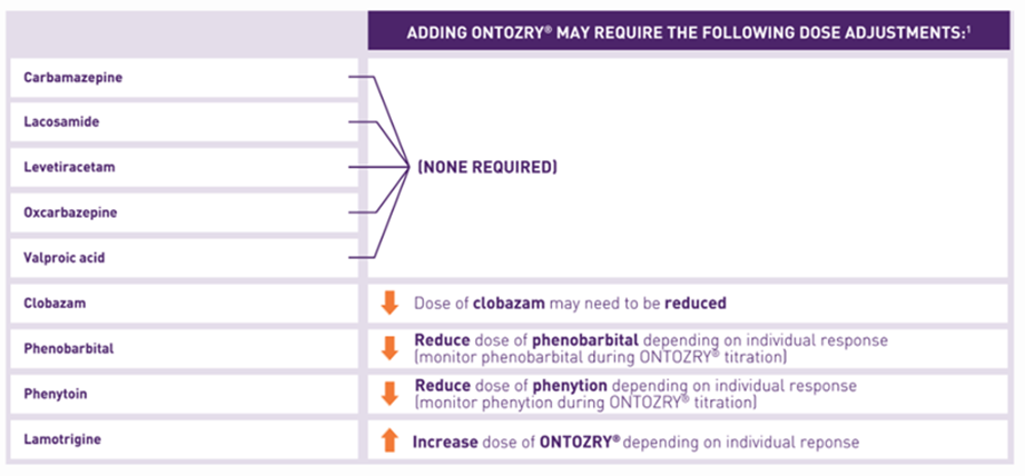 Some ASMs can also induce or inhibit Cytochrome P450 enzymes, affecting the plasma levels of concomitant drugs and their active metabolites. A slow titration schedule of ONTOZRY®, with proactive adjustment of concomitant ASMs, can help minimise TEAEs.5