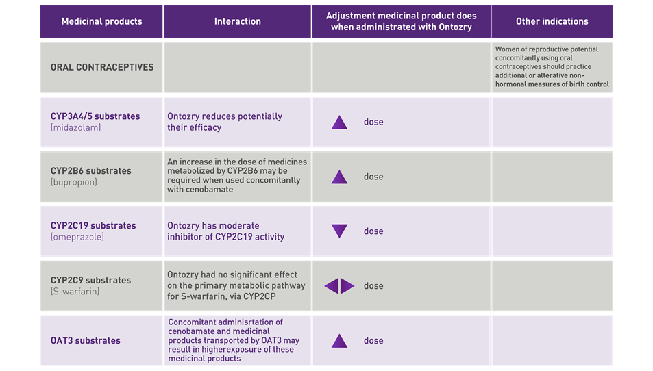 Cenobamate is extensively metabolized, primarily by glucuronidation, with oxidation contributing to a lesser degree. ONTOZRY® can interact with other medicinal products, due to its ability to induce or inhibit enzymes that belong to the Cytochrome P450 system, requiring adjustments of the dose of these medicinal products.