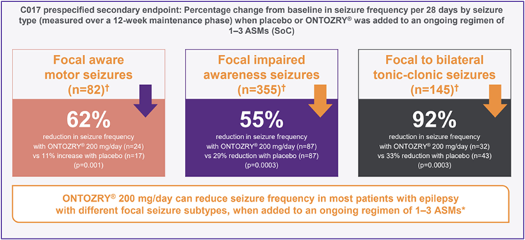 Adjunctive ONTOZRY® reduces seizure frequency in patients with epilepsy with different focal seizure subtypes.1